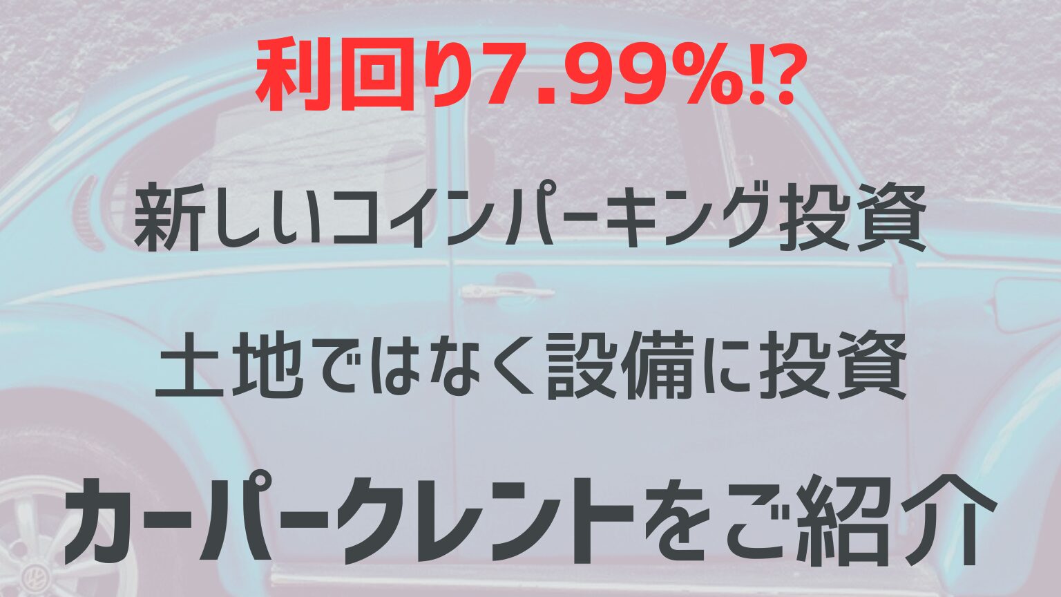 高利回りで注目されているカーパークレント(コインパーキングの設備機器投資)の利回りはなんと7.99%!この魅力的な数字に「ちょっと気になる」と思う反面「本当に大丈夫かな?」と心配になる方もいるかもしれません。そこでこの記事では、実際にカーパー... -
